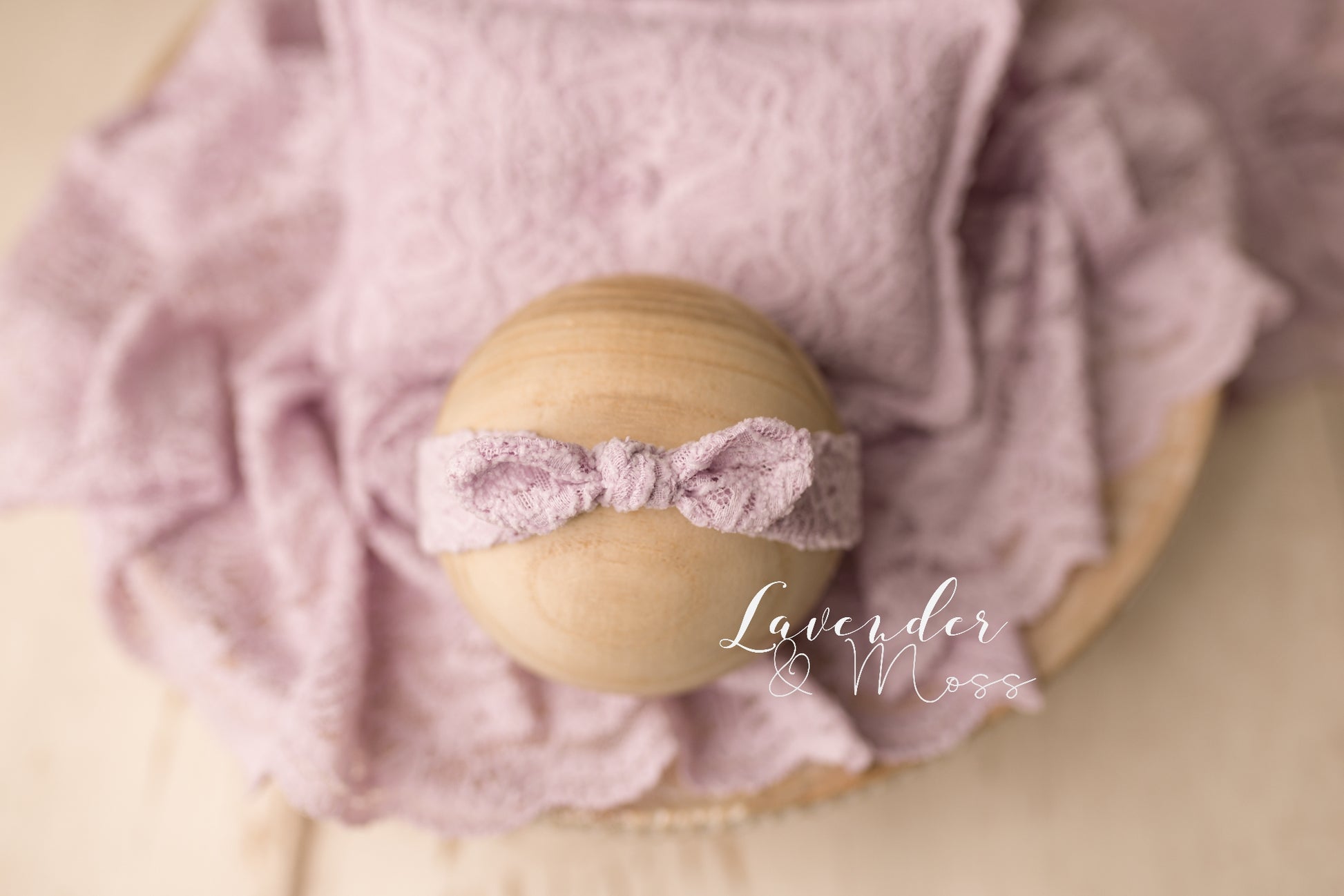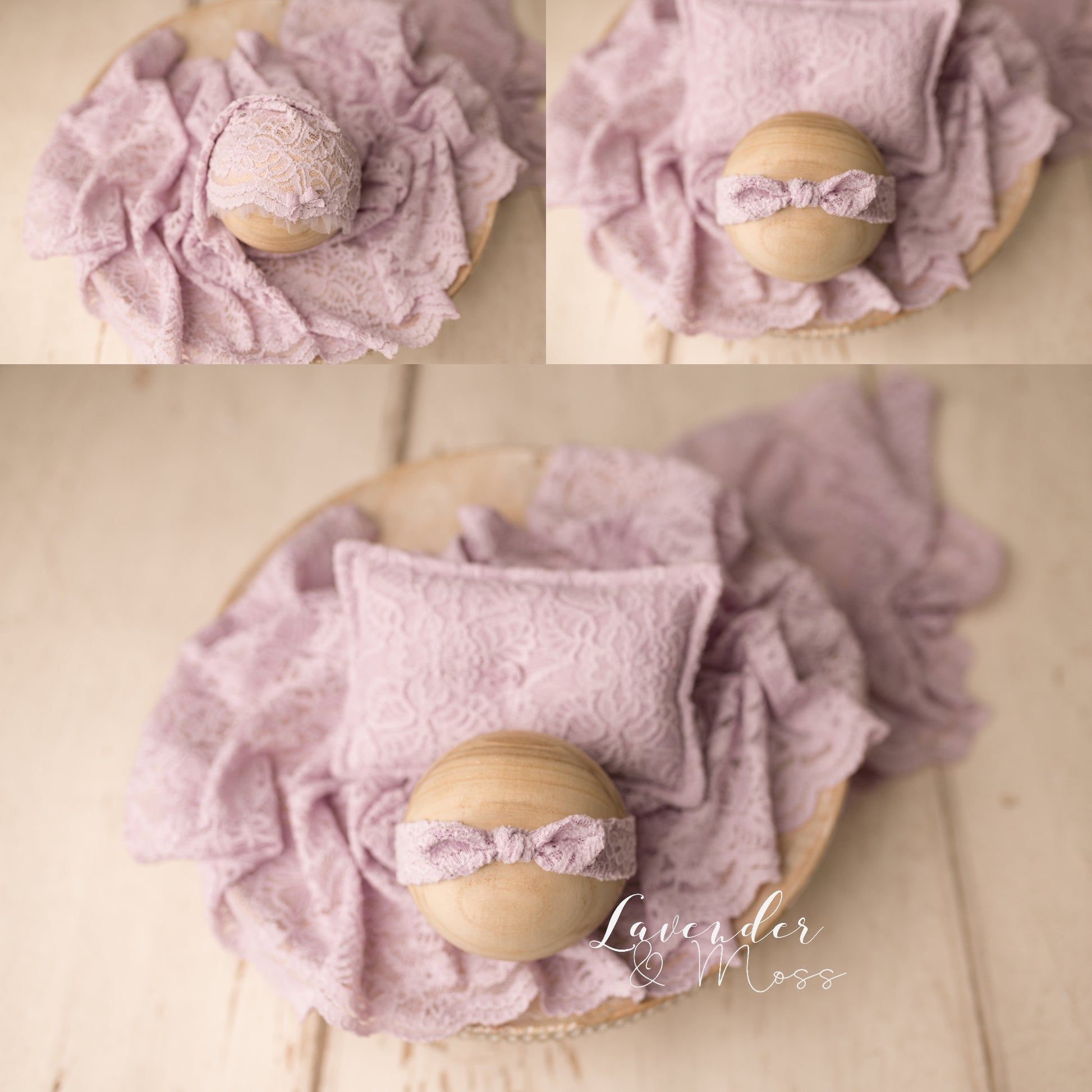 Delicate lace collection including a layer, headband, pillow and sleepy cap.