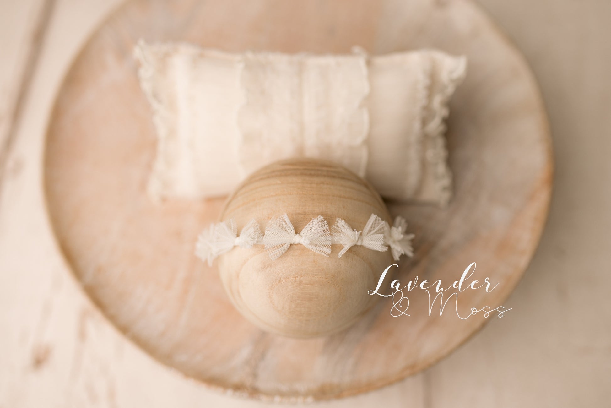 Delicate collection including a tulle bonnet and a matching pillow in cream and pink.