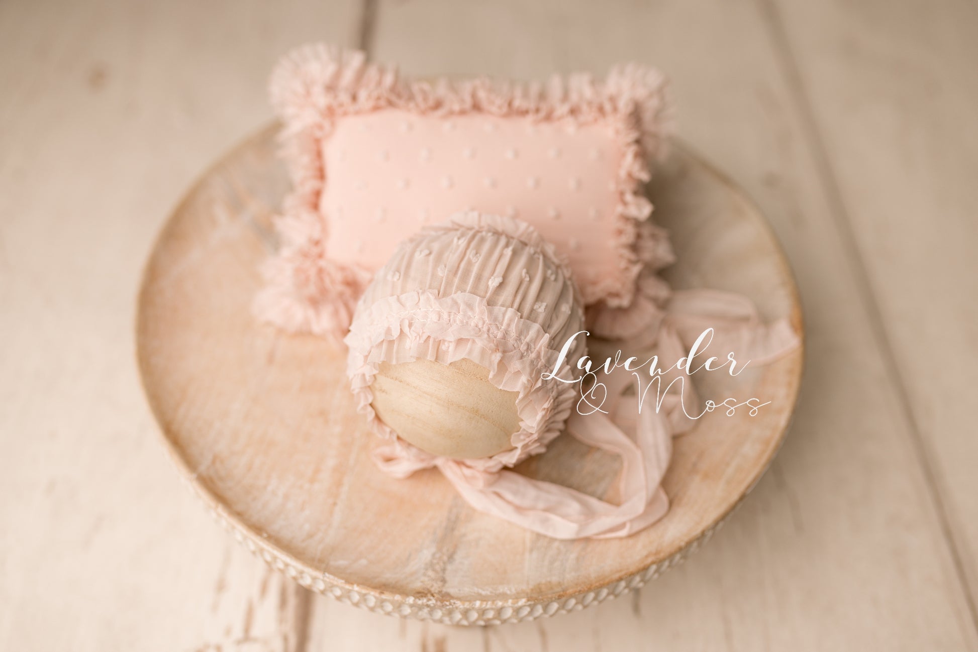 Delicate chiffon collection including newborn bonnet with and frilly pillow.